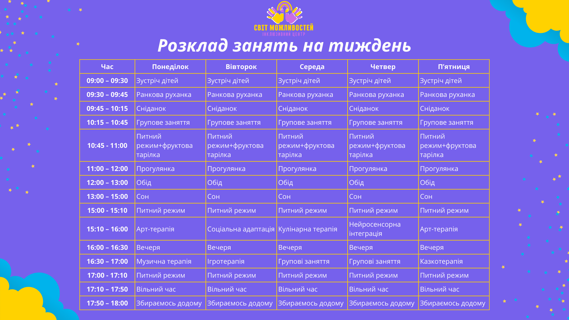Заняття, спрямовані на соціальну інтеграцію, розвиток самостійності та підготовку до навчання. Ми допомагаємо дітям знайти друзів, розвинути навички комунікації та впевнено рухатися вперед.