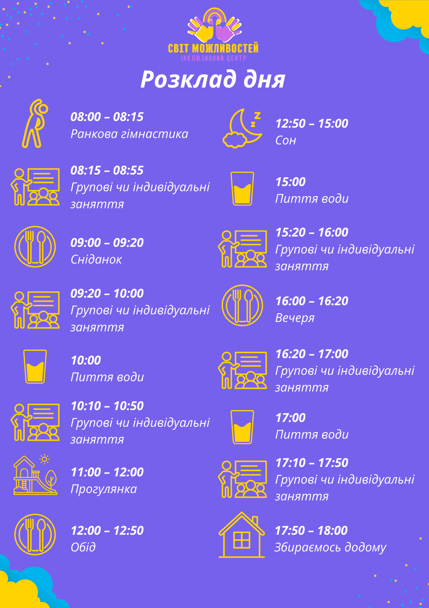 Заняття, спрямовані на соціальну інтеграцію, розвиток самостійності та підготовку до навчання. Ми допомагаємо дітям знайти друзів, розвинути навички комунікації та впевнено рухатися вперед.